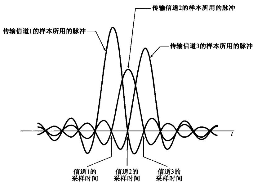 一个典型的微波中继系统的总带宽可达几千兆赫,而这个带宽比单个声音信道要求的带宽大得多。如果有频谱互相重叠的单个声音信号,利用正弦幅度调制把它们的频谱在频率上进行搬移,使这些已调信号的频谱不再重叠,就能够在同一个宽带信道上同时传输这些信号。这就是频分多路复用(frequency-division multiplexing,FDM)的概念。利用正弦载波的频分多路复用原理如图8.15所示。每一个欲传输的信号假设都是带限的,并且用不同的载波频率进行调制,然后把这些已调信号组合在同一个通信信道上同时传输。每一个子信道和复合多路信号的频谱都示于图8.16中。通过这一复用过程,每一输入信号都安排在这个频带内