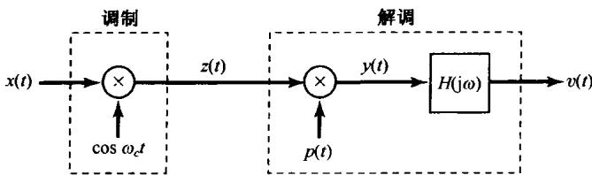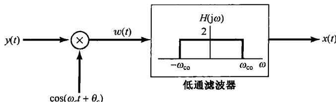 在通信系统的接收端,载有信息的信号 是经由解调而得到恢复的。这一节研究正弦幅度调制的解调过程。其中有两种常用的解调方法,每一种都有各自的优缺点。8.2.1节先讨论的第一种方法称为同步解调(synchronous demodulation),其中发射机和接收机在相位上是同步的;8.2.2节将介绍的另一种方法称为非同步解调(asynchronous demodulation)。