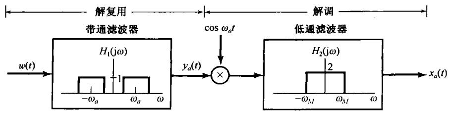 的不同部分。为了在解复用过程中恢复每一信道,要求有两个基本步骤:先用带通滤波器来滤出某一特定信道的已调信号,然后紧跟着利用解调来恢复原始信号。例如,要恢复信道 ,而又采用同步解调,则如图8.17所示。