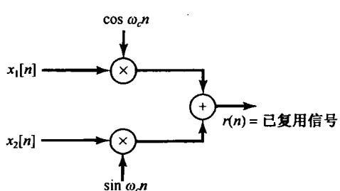 在 为实信号时,可以用图8.2来实现式(8.7)或式(8.8),这里要用两个单独的乘法器和两个相位相差 的正弦载波信号。在8.4节将给出一个应用的例子来说明使用图8.2所示的系统(用两个相位差 的正弦载波)将具有一些特别的好处。