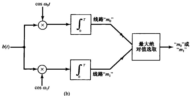 8.39 设想希望传送两个可能的消息中的一个,即消息 或消息 。为此,在长度为 的时间间隔内,发送两种频率之一的高频脉冲。注意, 与传送哪一个消息是无关的。对消息 将送出 ,而对消息 则送出 。于是,脉冲 看上去如图 P8.39(a) 所示。这种通信系统称为频移键控(FSK)。当高频脉冲 被收到时,就要判断它是代表消息 还是消息 。为此,按图 P8.39(b) 的方案去实现。