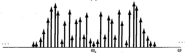 图8.14 同步与非同步正弦幅度调制系统频谱的比较。(a)调制信号的谱;(b)在同步系统中代表已调信号 的谱;(c)在非同步系统中代表已调信号 的谱