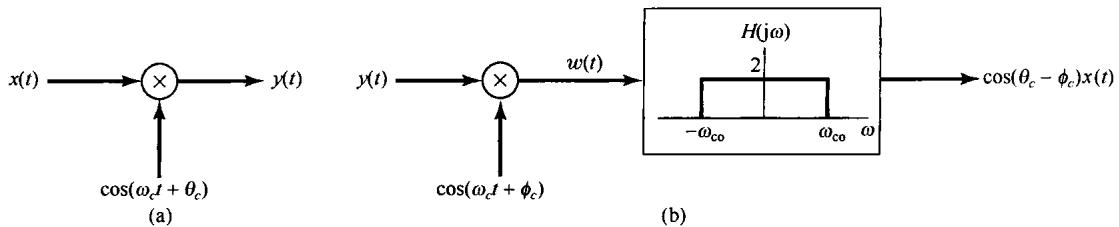 在图8.7和图8.8所示的系统中,都假设解调器载波在相位上与调制器载波是同相的,因而这一过程称为同步解调(synchronous demodulation)。然而,以下分析当调制器和解调器在相位上不同步时这两种系统的解调结果。在复指数载波的情况下,用 代表调制用载波的相位,用 代表解调用载波的相位,即