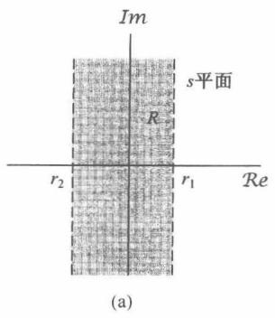 一个双边(two-sided)信号就是对 和 都具有无限范围的信号,如图9.9(a)所示。对于这样一个信号,其收敛域可以这样求出:选取任一时间 ,然而将 分成右边信号 和左边信号 之和,如图9.9(b)和图9.9(c)所示。 的拉普拉斯变换的收敛域就是能使 和 两者的拉普拉斯变换都收敛的区域。根据性质4,对于某 值, 的收敛域由 的半平面组成;而根据性质5,对于某 值, 的收敛域由 的半平面组成。 的收敛域就是这两个半平面的重叠部分,如图9.10所示。当然,这里假设 ,因而这两半平面有某些重合。如果不是这种情况,那么即使 和 的拉普拉斯变换存在, 的拉普拉斯变换也不存在。