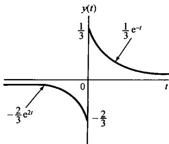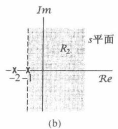 为了确定它的收敛域,我们注意到,因为 是两个实指数信号的和,而由式(9.21)可知, 是单独每一项的拉普拉斯变换之和。第一项是 的拉普拉斯变换,而第二项是 的拉普拉斯变换。由例9.1知道