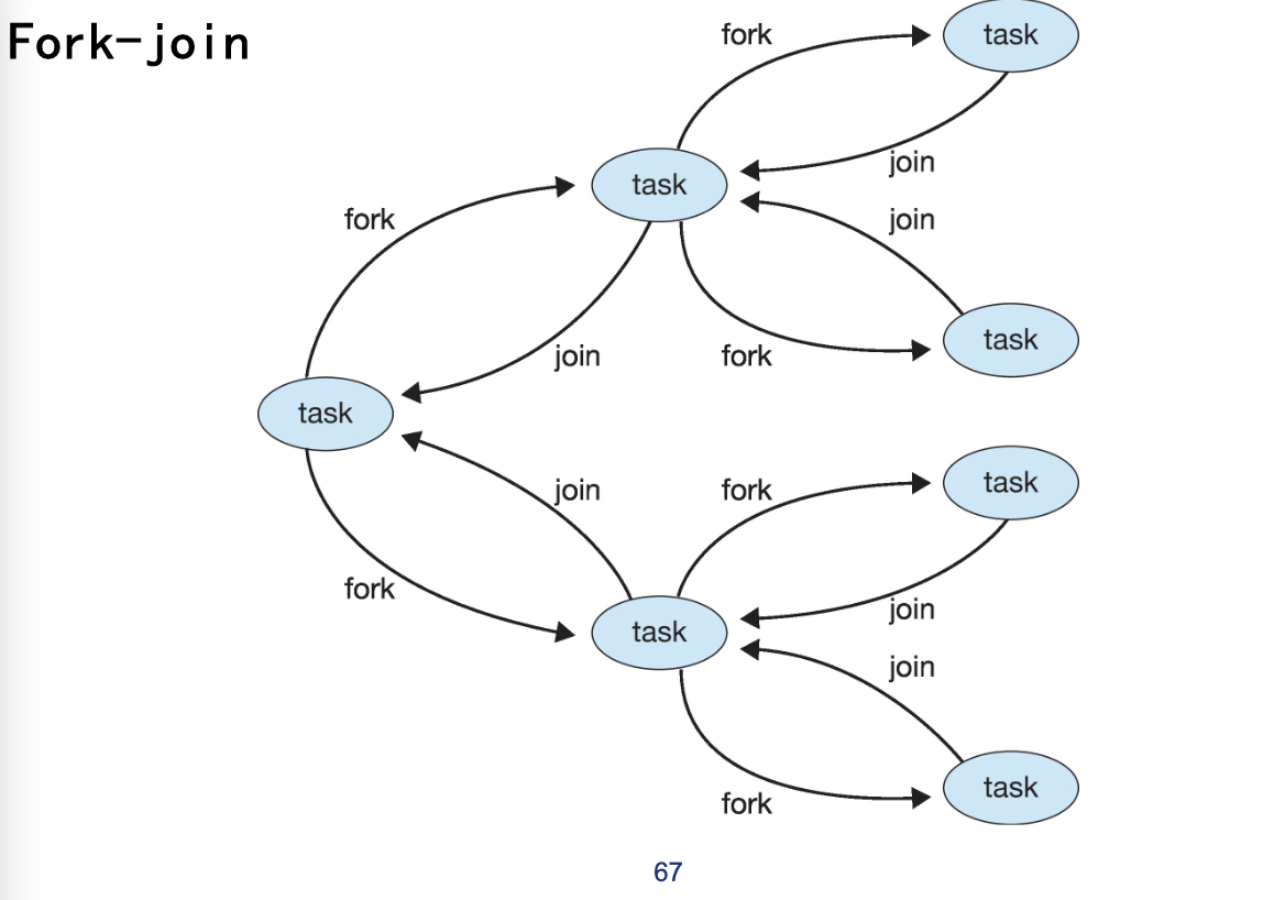 - 任务并行性:将任务而不是数据分配到多个计算核心,每个线程执行唯一操作,不同线程可以操作相同的数据,也可操作不同数据