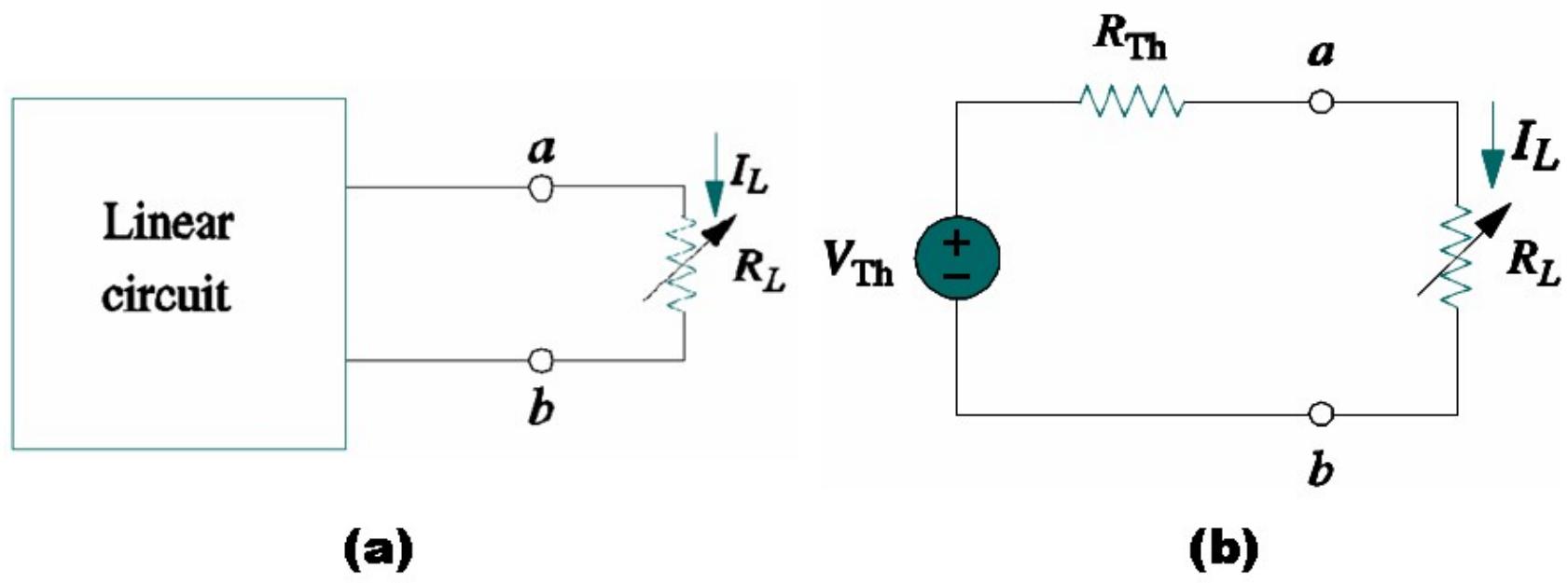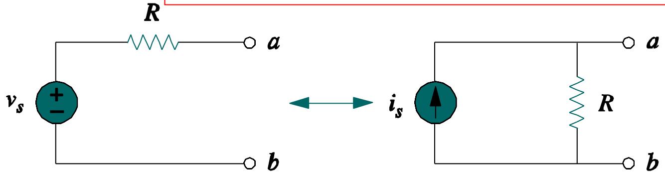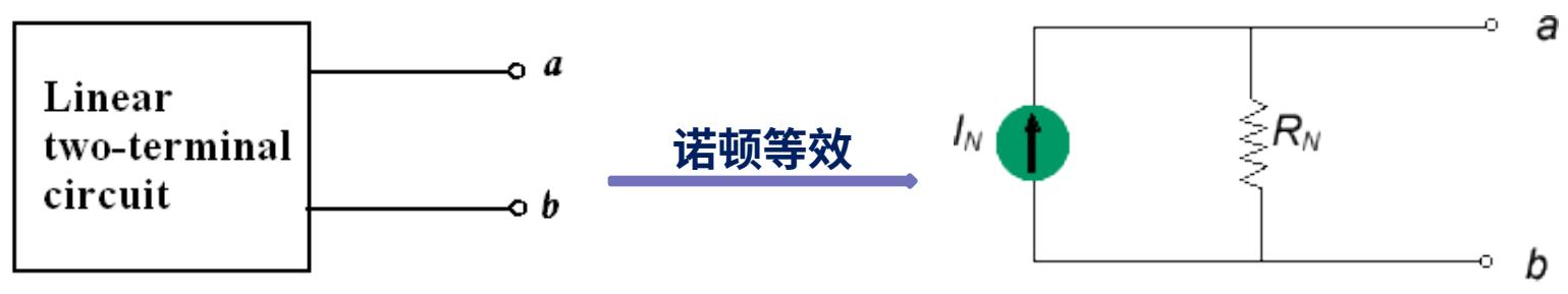 戴维南定理和诺顿定理允许我们将电路网络中的一部分孤立,而将网络的其余部分用一个等效网络来替代。戴维南等效电路由一个电压源 串联电阻 组成,而诺顿等效电路由一个电流源 并联电阻 组成。这两个定理是由电源变换联系起来的。V