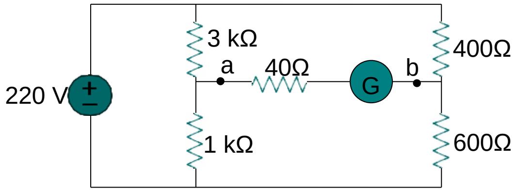 图 4.64 中的电路为不平衡电桥 . 如果检流计的电阻是 40Ω, 求通过检流计的电流 .