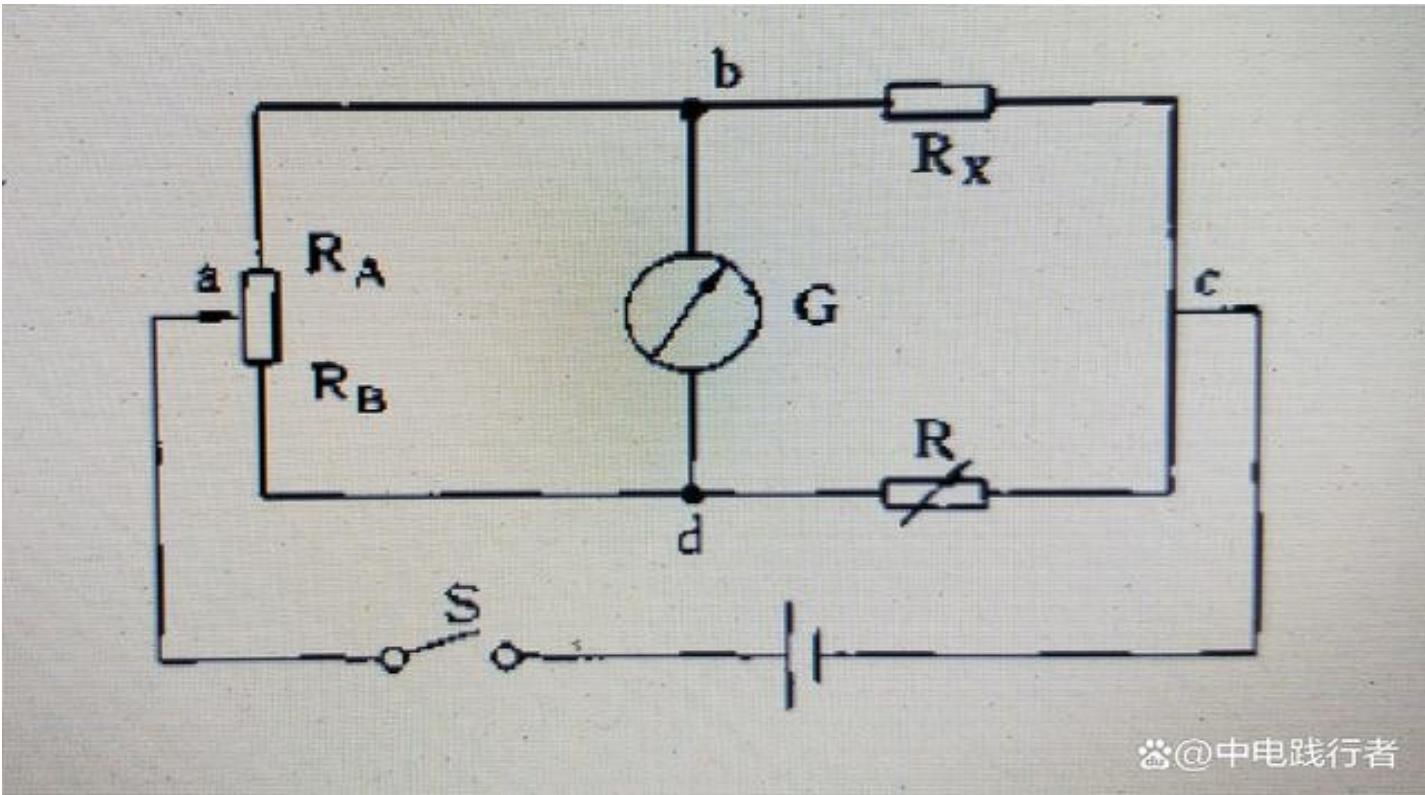 CD之间接入了一个检流计 G. 当 G 上检测到的电流为 0 时,CD 间开路,且Vc=Vd,(R1+R3)||(R2+R4)
